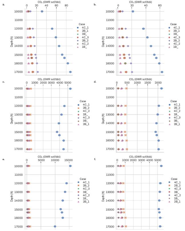 Using CPA EoS and 8 different association schemes (7 from literature and 1 from DM), the thermodynamic behavior of CO2, water and hydrocarbon systems was studied in a CO2 injection process (10 - 80 mole%) and water content (25 and 50 mole%) for a case study of a depleted reservoir in Colombia. The evaluation was performed based on variables such as Gas - Oil Ratio (GOR - scf/bbl), crude oil and water density for swelling processes, Gas - Water Ratio (GWR - scf/ bbl) of CO2 and C1 to quantify solubilities and saturation pressures to estimate the pressurization of the different systems.