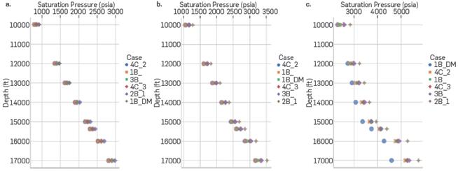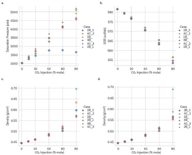 El esquema 4C_1, en condiciones de inyección de CO2 superiores al 40%, predice valores de solubilidad de CO2 superiores a 2000 scf/ bbl en comparación con los otros esquemas de literatura y los datos experimentales. El esquema 2B_2 presenta inconsistencias en los cálculos de presión de saturación a altos contenidos de inyección de CO2, ya que a 60% reporta un valor de 2800 psia y a 80% un valor de 2600 psia. Este comportamiento es opuesto al reportado en la literatura. Por lo tanto, los esquemas de asociación 4C_1 y 2B_2 presentaron problemas termodinámicos para el cálculo de propiedades como solubilidades y presiones de saturación.