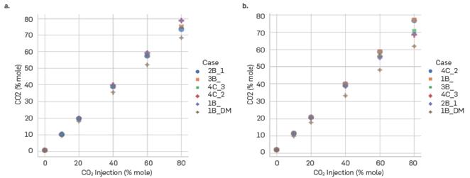 Scheme 4C_1, at CO2 injection conditions greater than 40%, predicts CO2 solubility values greater than 2000 scf/bbl compared to the other literature schemes and experimental data. Scheme 2B_2 presents inconsistencies in saturation pressure calculations at high CO2 injection contents since at 60% it reports a value of 2800 psia and at 80% a value of 2600 psia. This behavior is opposite to that reported in literature. Therefore, association schemes 4C_1 and 2B_2 presented thermodynamic problems for the calculation of properties such solubilities and saturation pressures.
