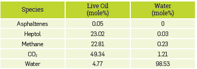 Case Study. Table 1 shows a summary of the main properties of the reservoir fluid used in this study. This fluid has composition, conventional PVT experimental tests, CO2 injection tests, minimum miscibility pressures, and asphaltene content. All this experimental information enabled us to build a robust, complete, and thermodynamically consistent fluid model for this fluid system. All simulations in this study were carried out using the EoS Peng-Robinson(Peng & Robinson, 1976Peng, D.-Y., & Robinson, D. B. (1976). A new two-constant equation of state. Industrial & Engineering Chemistry Fundamentals, 15(1), 59-64. https://doi.org/10.1021/i160057a011