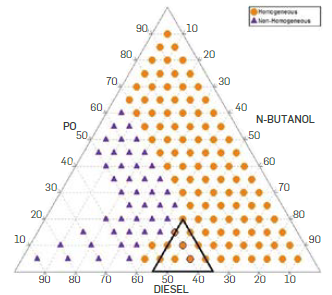 ). Therefore, it is necessary to add chemical additives to blend PO homogeneously with conventional hydrocarbon fuels and use it successfully as fuel in engines. Stable and uniform mixes of diesel and PO can be created by adding n-butanol as organic solvent (Huang et al., 2012Huang, Y., Han, X., Shang, S., & Wang, L. (2012). Performance and emissions of a direct-injection diesel engine operating on emulsions of corn stalk bio-oil in diesel. Proceedings of the Institution of Mechanical Engineers, Part D: Journal of Automobile Engineering, 226(8), 1119-1129. https://doi.org/10.1177/0954407012438295