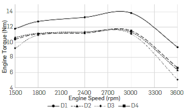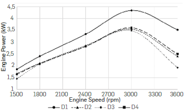 Maximum engine torque and power were achieved with D1 fuel. Compared to D1, engine torque, and power values for D2, D3, and D4 fuels were lower at all engine speeds. This reduction is attributed to the higher viscosity and lower LHV of the blended fuels.