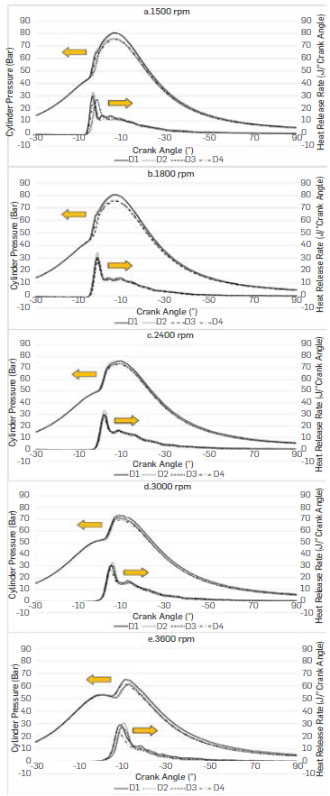The cylinder pressure peak of D3 and D4 fuels containing PO was lower at all engine speeds than D1 and D2 fuels. D2 exhibited the highest cylinder pressure, which is derived from the higher n-butanol content.