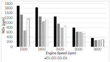 NOx emissions from D2, D3, and D4 fuels were remarkably lower than D1 at all engine speeds and full load. Additionally, NOx emissions from the blended fuels decreased with increasing engine speed.