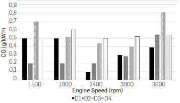 CO emissions of blended fuels at varying engine speeds D1: Diesel 100% / PO 0% / NB 0% / 2-EHN 0%, D2: Diesel 40% / PO 0% / NB 55% / 2-EHN 5%, D3: Diesel 40% / PO 5% / NB 50% / 2-EHN 5% and D4: Diesel 40% / PO 15% / NB 40% / 2-EHN 5%