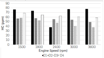 The HC emissions from D2, D3, and D4 fuels were lower than D1at all engine speeds. This reduction is likely due to the increased oxygen content from the addition of PO, n-butanol, and 2-EHN in fuel mixtures.