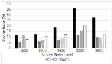 Soot emissions of D2, D3 and D4 blended fuels were lower at all engine speeds compared to D1 fuel. The amount of oxygen in blended fuels reduces as the PO ratio increases, leading to an increase in C/H ratios, and soot emissions.
