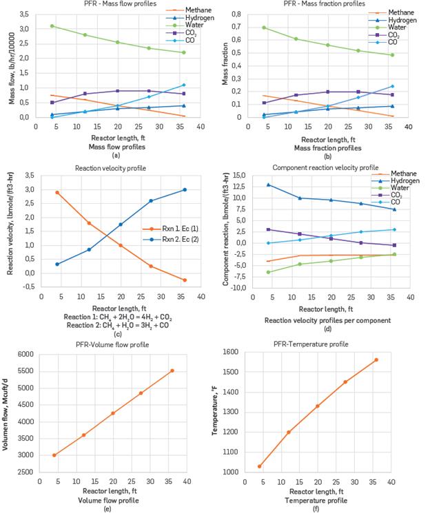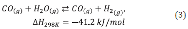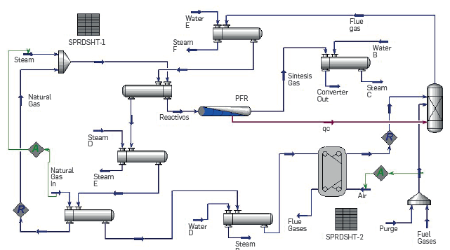 ), inside the tubes of a furnace called reformer. The reacting system, defined by equations (1-3) is endothermic (329.8 kJ/mol methane) and reversible, generating H2, CO and CO2 (Rostrup-Nielsen & Christiansen, 2011). The reformer output stream (syngas) is cooled and sent to a converter, where water and CO react giving way to more H2 and CO2 (equation 3, water-gas shift) (Shillawala et al., 2017; Amran et al., 2017Amran, U. I., Ahmad, A., & Othman, M. R. (2017). Kinetic based simulation of methane steam reforming and water gas shift for hydrogen production using aspen plus. Chemical Engineering Transactions, 56, 1681-1686. https://www.researchgate.net/profile/Mohamad-Othman-7/publication/316540135_Kinetic_Based_Simulation_of_Methane_Steam_Reforming_and_Water_Gas_Shift_for_Hydrogen_Production_Using_ Aspen_Plus/links/5902c96ca6fdcc8ed511a17a/Kinetic- Based-Simulation-of-Methane-Steam-Reforming-and-Water-Gas-Shift-for-Hydrogen-Production-Using- Aspen-Plus.pdf