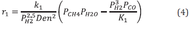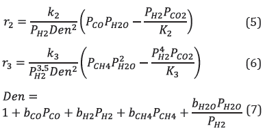 developed a Langmuir-Hinshelwood type model, expressed in equations 4-7. This model considers the parallel occurrence of reactions (1-3) over a Ni/ Mg catalyst supported on alumina. The model (4-7) has been used in different SMR process simulations at industrial level (Posada & Manousiouthakis, 2005Posada, A., & Manousiouthakis, V. (2005). Heat and power integration of methane reforming based hydrogen production. Industrial & engineering chemistry research, 44(24), 9113-9119. https://doi.org/10.1021/ie049041k