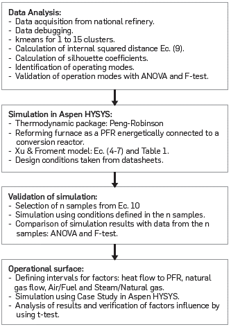 According to the literature review, reports that use the simulation tool have focused on the analysis of more energy-efficient strategies, which can lead to a decrease in cost and increased economic benefits. A weakness identified in this review is the lack of explicit validation of the SMR process simulations with process data by means of variance analysis (ANOVA) and/or an F-test. Also, simulations have been performed on defined conditions for the industrial process, without mentioning possible different operating schemes underlying the process data.