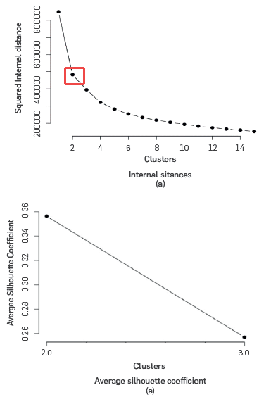 ). kmeans divides the data into k clusters such that the sum of distance between the data in the clusters is maximal, while the internal distances (from the data to their center in a cluster) are minimal (Thakare & Bagal, 2015Thakare, Y. S., Bagal, S. B., Kulkarni, U. V., Doye, D. D., Sontakke, T. R., Vadivel, A., Majumdar, A. K., Hung, M., Wu, J., Chang, J., quotAn, Wang, J., Su, X., Mankad, N., Eltibi, M.F., & Ashour, W. M. (2015). Performance Evaluation of K-means Clustering Algorithm with Various Distance Metrics. International Journal of Computer Applications, 110, 12-16. https://doi.org/10.5120/19360-0929