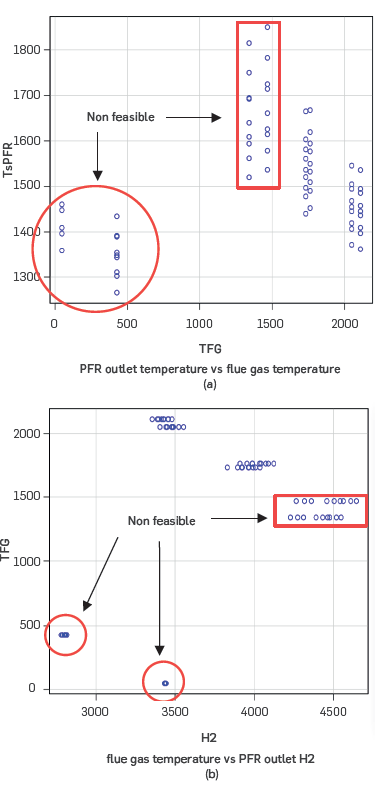 In sum, the analysis of the operational surface with the feasible cases suggests that H2 generation is influenced by the heat flow coming from the conversion reactor. Also, the feasible cases suggest a competition between the reforming reactions (1 and 2). In operation, a rise in flue gas temperature with excess air Leads to a decrease in heat flow to the PFR, with an increase in H2 generation by favoring reaction 1. The favoring of reaction 1 means an increase in the synthesis gas outlet temperature (TsPFR) due to the Lower energy requirement (165 kJ/mol). When reaction 2 is favored, the TsPFR decreases due to the higher energy requirement (206 kJ/mol).