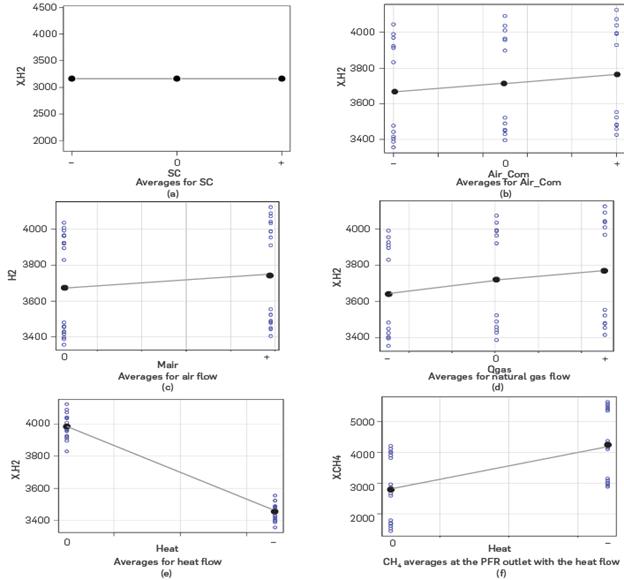 On the other hand, the effects of Air_Com ratio, air flow, and natural gas flow on H2 generation are presented in Figures 12b-12d, respectively. These figures suggest a slight increase in H2 generation with the value of their respective levels. Although these factors affect the convection section of the furnace, a statistical t-test Leads to conclude that the influence of these factors on H2 generation is null at the analyzed Levels. Regarding the heat flow, Figures 12e-f show the influence of this factor on H2 generation as well as the CH4 outflow from the reactor. According to these figures, H2 generation ncreases with heat flow (from "-" to "0" level) in a statistically significant way, coinciding with what reported by Jabbour et al. (2017)Jabbour, K., Massiani, P., Davidson, A., Casale, S., & El Hassan, N. (2017). Ordered mesoporous “one-pot” synthesized Ni-Mg (Ca)-Al2O3 as effective and remarkably stable catalysts for combined steam and dry reforming of methane (CSDRM). Applied Catalysis B: Environmental, 201, 527-542. https://doi.org/10.1016/j.apcatb.2016.08.009