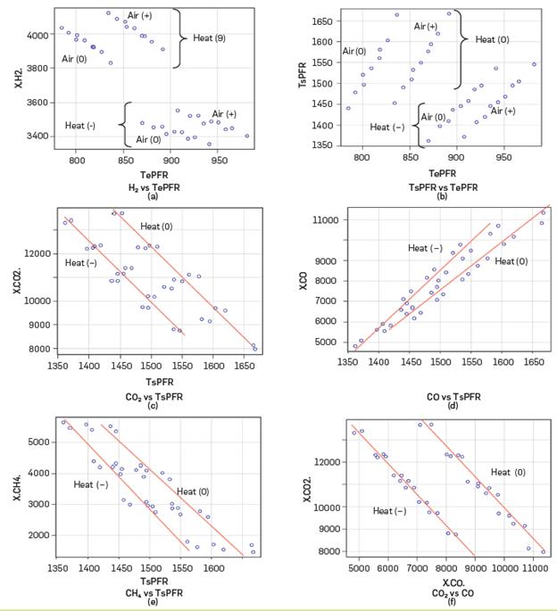 The trends between the response variables and various factors combined are shown in Figures 13a-f. Accordingly, the response variables present two separate trends, defined by the Lower ("-") and middLe ("0") Levels of heat flow to the PFR (Table 3). For the influence of the PFR inlet temperature factor, TePFR, on H2 generation (Figure 13a) and on the PFR outlet temperature, TsPFR, (Figure 13b) each heat flow Level presents two divisions, according to the middle ("0") and upper ("+") Level of air flow to the conversion reactor (i.e. the combustion process in the reformer). It follows from Figure 13a that H2 generation increases with decreasing TePFR and increasing heat flow to reactor; Likewise, an increase in air flow allows keeping H2 generation constant with increasing TePFR. Conversely, according to Figure 13b, the TsPFR increases with increasing TePFR and heat flow. Likewise, TsPFR can be kept at certain level by increasing air flow and increasing TePFR. The influence of air flow on the response variables shows the dependence of the reforming reaction on the combustion process in the furnace. This had not been explicitly considered in previous simulations of the SMR process.