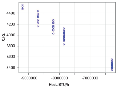 , in their analysis of an industriall plant by simulation, report a stationary zone in H2 generation for moderate temperatures and heat flows. To deepen this aspect, the analysis of the operational surface was complemented with indoor Levels in the intervals defined for the factors (Table 3). The feasible cases with convergence in the new Case Study (66 feasible cases) were grouped with those of the previous one (108 feasible cases). Figure 14 presents the trends obtained with all the feasible cases (174) for H2 generation with respect to heat flow and natural gas flow to reforming (parametrically). In this figure, the vertical points correspond to different values of natural gas to be reformed; the higher the Location of the point, the higher the value of natural gas to be reformed. According to Figure 14, the higher H2 generation is achieved with higher values of heat received and higher value of natural gas to reformed. However, the increase in H2 generation is stabilized with the higher values of heat and natural gas, tending to a steady state value (closer proximity between the vertical points). This result agrees with Abbas et al., 2017Abbas, S. Z., Dupont, V., & Mahmud, T. (2017). Kinetics study and modelling of steam methane reforming process over a NiO/Al2O3 catalyst in an adiabatic packed bed reactor. International journal of hydrogen Energy, 42(5), 2889-2903. https://doi.org/10.1016/j.ijhydene.2016.11.093