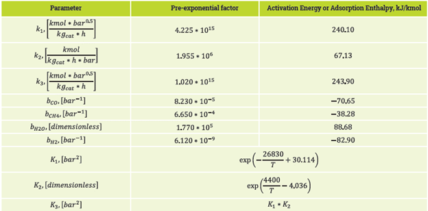 Constants for the kinetic model proposed by Xu & Froment (1989)Xu, J., & Froment, G. F. (1989). Methane steam reforming, methanation and water-gas shift: I. Intrinsic kinetics. AIChE journal, 35(1), 88-96. https://doi.org/10.1002/aic.690350109