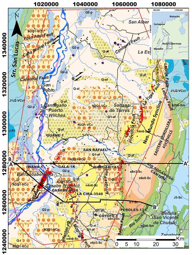 Regional geological mapping and seismic information show predominance of compressional structures along the central part of the MMV basin, with a general trend S – N to SSW – NNE (Figs. 1 y 3). One of the faults with the greatest extension and displacement is the La Salina Fault, which delimits a large part of the western edge of the Eastern Cordillera (Fig. 3). This regional structure has been interpreted as the result of a tectonic inversion process, beginning in the Early Cretaceous as a normal fault, controlling the distribution and thickness of sediments along the western edge of the Eastern Cordillera, and subsequently reactivating during the Eocene - Miocene as a reverse fault by regional compression (Sarmiento, L.F.; 2002, Cooper, et al. 1995). In the hanging block of the La Salina Fault, the Nuevo Mundo Syncline is found (Fig. 3), whose folding begins at the end of the Oligocene (Caballero, V.; Parra, M.; Mora, A. 2010). During the time of regional compression, sedimentation along the central part of the MMV basin was affected by other reverse faults such as Arrugas and Infantas (Cabello, et al. 2018), with slight reactivation during the Neogene (Caballero, V.; Parra, M.; Mora, A. 2010, Reyes, Kley and et.al 2012). Others faults with a SW – NE trend such as Casabe, Cimitarra, Caña Braval and Pozo Azul (Figs. 1 and 3), affect the Meso – Cenozoic sedimentary sequence of the basin, control the distribution of hydrocarbons in fields such as Gala, Galan, Cardales, Llanito and Casabe, and guide in some sectors the current course of the Magdalena River (Gómez, et al. 2015, Vargas, M. L.; 2021, París, et al. 2000). Additionally, the analysis of regional earthquake activity suggests that these faults tend to accumulate strain at depths less than 10 km, especially towards the eastern flank of the Central Cordillera, decreasing as they deepen towards the east (Londono 2019, López 2004).