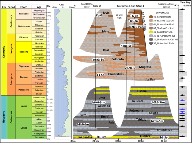 Strong tectonic activity is evidenced in sequences of conglomeratic arenites and varicolored arenites and mudstones, corresponding to the La Paz and Esmeraldas formations (target reservoirs for O&G in the area), which rest discordantly on Mesozoic and Paleocene sequences (Fig. 2), accumulated in fluvial depositional environments, during the Eocene (Caballero, Parra, et al. 2013, Caballero, Rodríguez, et al. 2019). During the Oligocene - Miocene, the central part of the MMV basin received sediments from the incipient uplift of the Central and Eastern cordilleras, mainly varicolored arenites and mudstones (Fig. 2), corresponding to the Mugrosa and Colorado formations (O&G reservoirs in the basin), accumulated in continental depositional environments with lacustrine influence (Cabello, et al. 2018). The widespread uplift of the Eastern Cordillera from Miocene to Holocene, along faults such as La Salina, (Horton, Parra and Mora 2019), increased sedimentation rates in the area, with increasing size sediments (Fig. 2), accumulated in high energy depositional environments, corresponding to the Real Gr. and Mesa Fm. (Mora, et al. 2013).