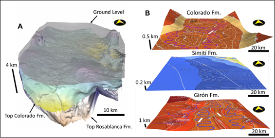 Figure 4. Examples of information integration to build GDEMs and PDWMs, key inputs for the Forward Stratigraphic Modeling: A) Block diagram of selected structural surfaces resulting from regional seismic interpretation; B) Gross Depositional Environmental Maps and Paleo Deep Water grids at selected tops of Meso – Cenozoic formations (Jurassic Girón Fm, Cretaceous Simití Fm and Miocene Colorado Fm), constructed from the integration of isopach maps obtained from the seismic interpretation, paleoenvironmental interpretations from well and stratigraphic columns descriptions, published regional paleogeographic maps and analogues from modern sedimentary environments.