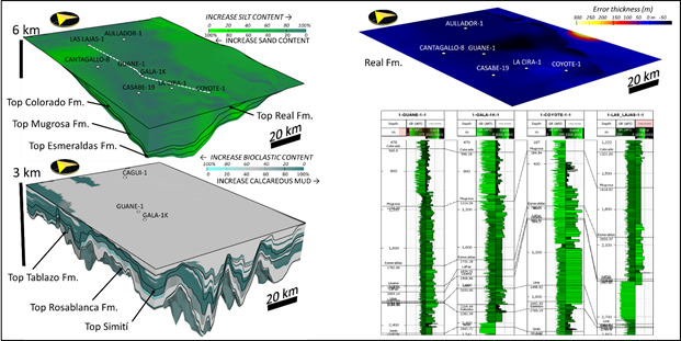 Figure 5. Results of FSM and its calibration. Top left, 3D model of sediment distribution for the mainly siliciclastic sedimentary sequences during the Cenozoic and below, carbonates during the Mesozoic. The upper right corner shows an example of thickness calibration due to differences between maps derived from seismic interpretation vs stratigraphic modeling for the Real Gr., while below an example of the results of the calibration between lithologies derived from Gamma Ray well logs (left column) vs VSh resulting from modeling (right column) is presented.