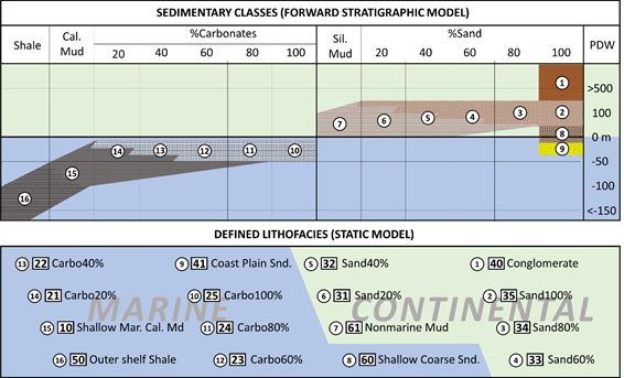 Figure 7. Explanatory legend of sedimentary classes (continuous properties) defined during the FSM (Above), considering the percentage of carbonates and sands vs the paleodepth water (PDW) in which the sediments accumulated and their equivalence in discretized lithofacies (Below), which was defined to populate the basin model. Numbers in a white circle indicate the sedimentary classes defined in the FSM, while the numbers in a white box indicate the corresponding discretized lithofacies in the basin model (these numbers refer to the lithofacies model shown in the 3D model of Fig. 6).