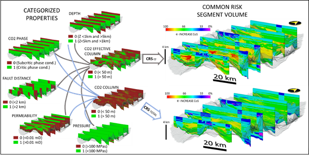Analysis using Common Risk Segment Maps (CRSM) has been a very useful tool in O&G exploration and applicable to the regional evaluation of any geological resource. Considering that CO2 capture, and sequestration (CCS) constitutes a geological resource that can be evaluated as commodities in terms of resources and reserves (Bachu, S.; 2008, Pale Blue Dot 2019), the use of CRSM analysis and uncertainty are conceptually valid for the screening of the best sites for storage. Thus, under the concept of CRSM analysis, it is possible to define corridors with better conditions for CCS activities, defining plays, mapping their distribution, identifying their variations, estimating their geological Chance of Succes (CoS) and creating a composite map by their combination (Bump, Hovorka y Meckel 2021). Some key factors in subsurface CO2 storage are storage capacity, injection (directly related with the permeability) and containment due to seal integrity (Bump, Hovorka and Meckel, 2021), which can be derived from static models such as the one built for the MMV basin area.