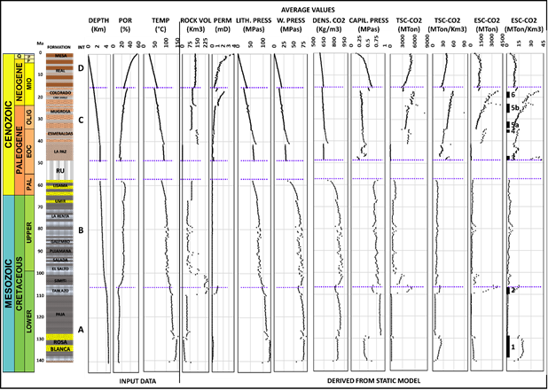 In this work we have calculated the ESCCO2, incorporating the effective height of the CO2 column that can be retained (Eff.C.H.CO2), since it includes variables such as CO2 density, capillary pressures of the seal and the reservoir. Furthermore, capillary pressures depend on CO2 saturation and rock porosity, which in turn depend on the pressure regime. Estimating ESCCO2 using Eff.C.H.CO2 allows all conditions simulated by the basin model in each cell to be considered and avoids the use of an efficiency factor that can be subjective.